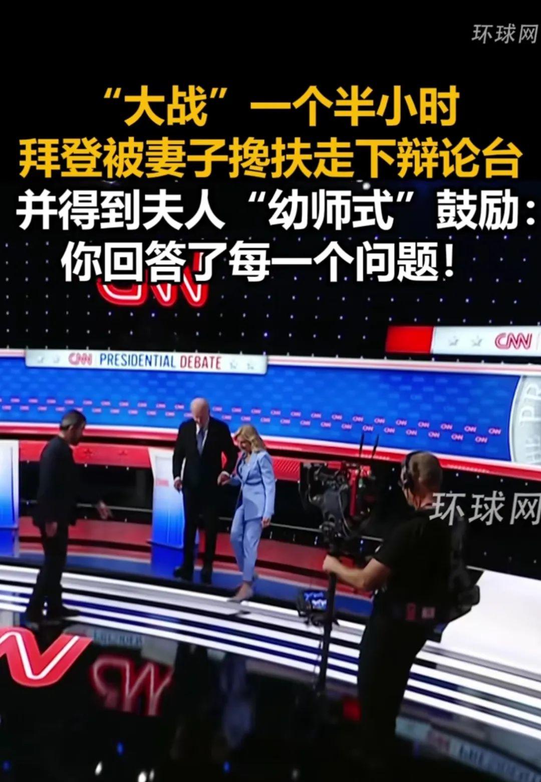 不過最逆天的還是拜登的老婆,在拜登被特朗普吊打完以後,拜登的老婆跑過來,就好像攙扶小寶寶一樣,把拜登給扶下去了。