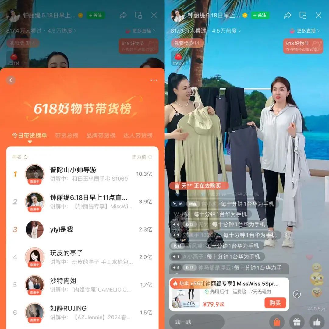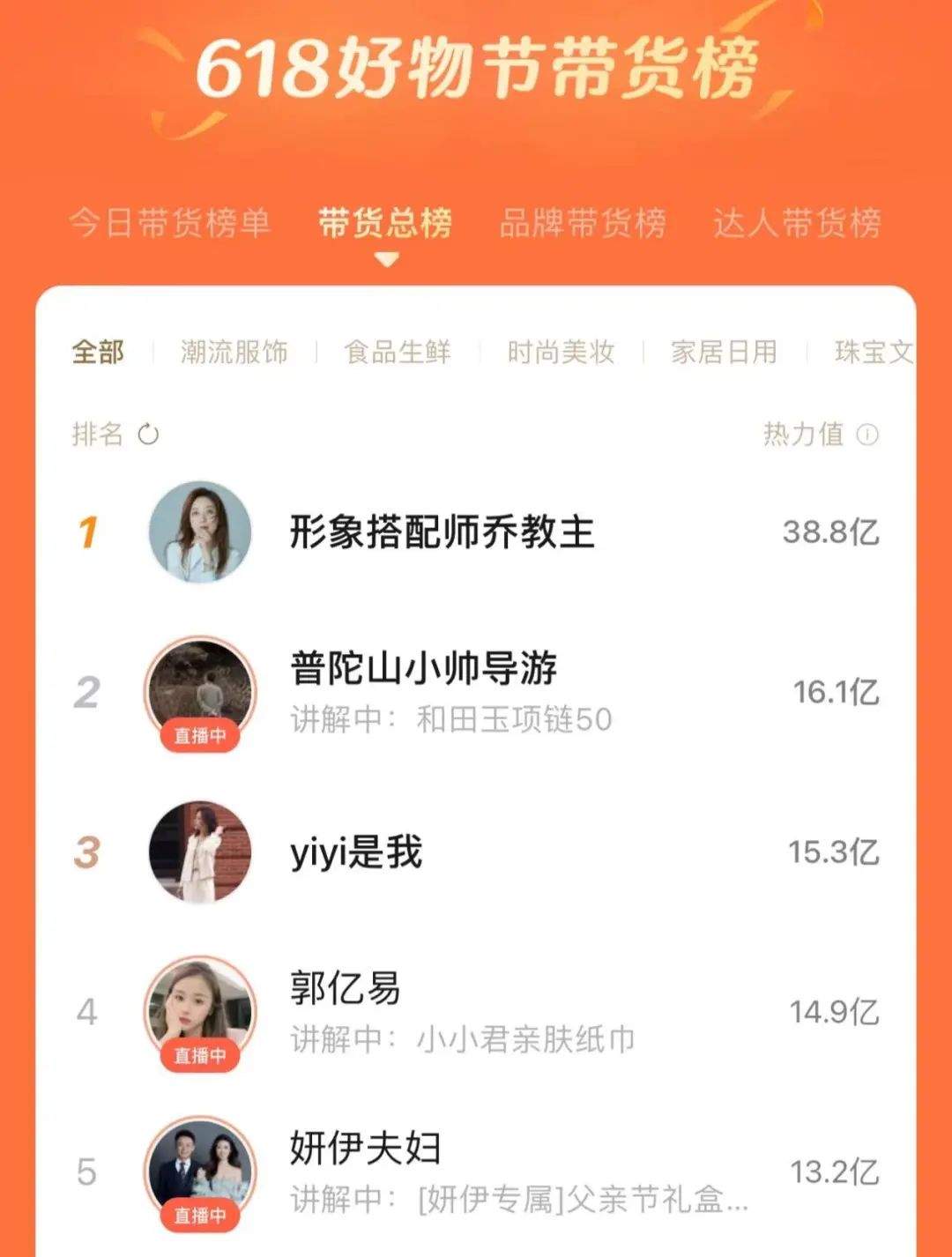 6月18日當晚10點,帶貨總榜前五名分別為“形象搭配師喬教主”、“普陀山小帥導遊”、“yiyi是我”、“郭億易”、“妍伊夫婦”,最高熱度值達到38.8億。