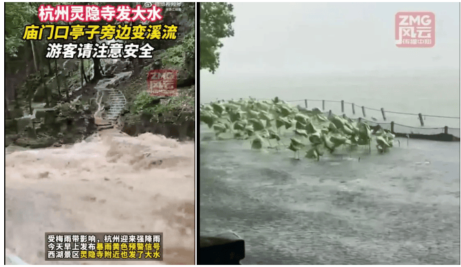 左:靈隱寺發大水,右:西湖邊狂風暴雨 來源:網絡