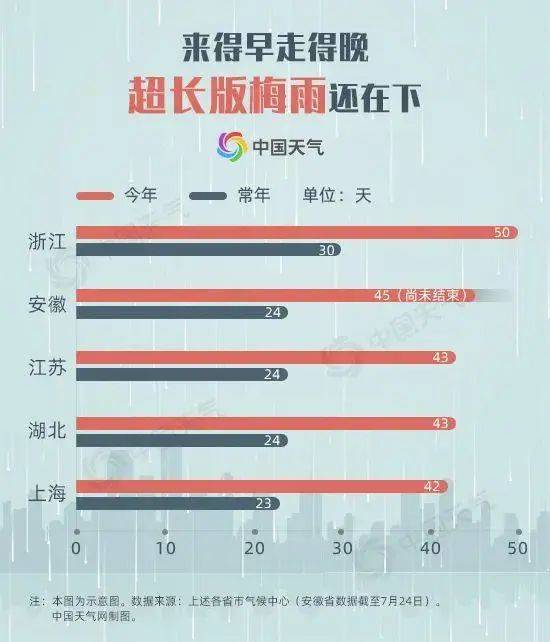 那一次,浙江經歷了整整50天的梅雨季,比常年偏多了20天。江蘇、湖北、上海也經歷了42-43天的超長梅雨期,上海、江蘇南京均為本世紀以來最長梅雨季。安徽、湖北、重慶降雨量為歷史同期最多,貴州、江蘇、上海為第2多,江西、浙江為第4多。