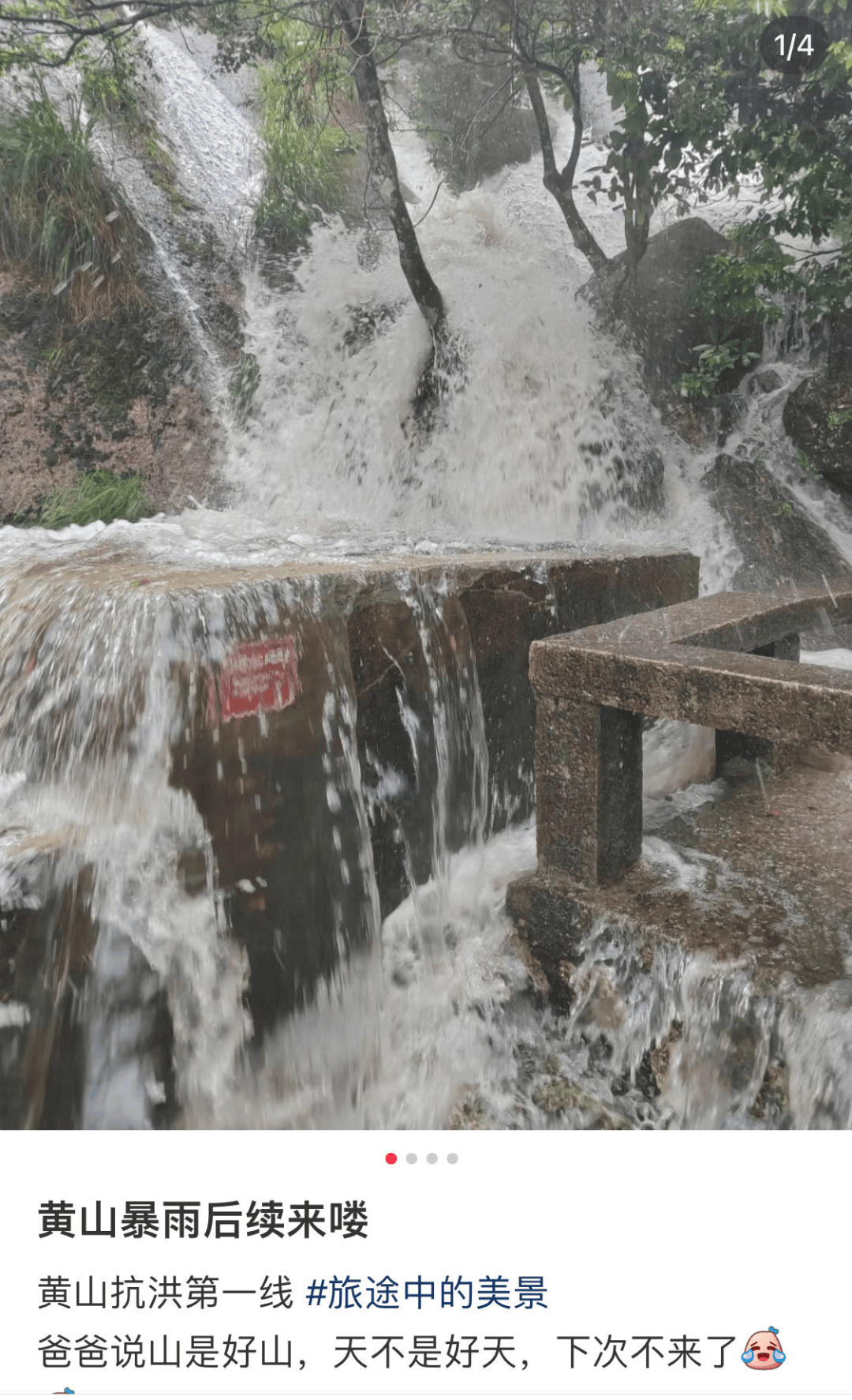 **黃山暴雨!**海拔1000多米的黃山山頂,居然出現了“瀑布”,簡直史無前例。黃山景區派出150餘人的“保護古樹小分隊”,尤其對迎客松、黑虎松實行全天值守。
