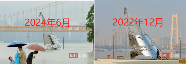 不鏽鋼雕塑作品《漁樂》底座以上1米已沒入武漢江水中,來源:極目新聞
