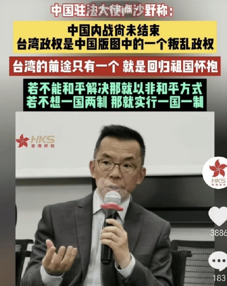 “一定意義上講,中國的內戰還沒有結束,目前在台灣的政權是中國版圖中的一個叛亂政權。中國政府隨時有權驅逐這個政權,把台灣的治理權重新收回來…..如果有人不想要“一國兩制”,那就實行“一國一制”。總之,我們是絕不允許台灣從祖國分裂出去的。”