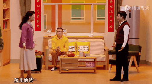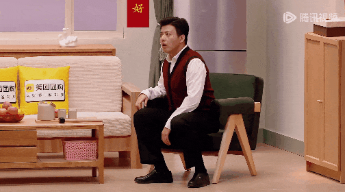 在下面這個場景裏,鏡頭給到了孩兒他爸,然後根據套路,孩兒他爸大概率會表演一個“驚慌失措”的掉凳兒。