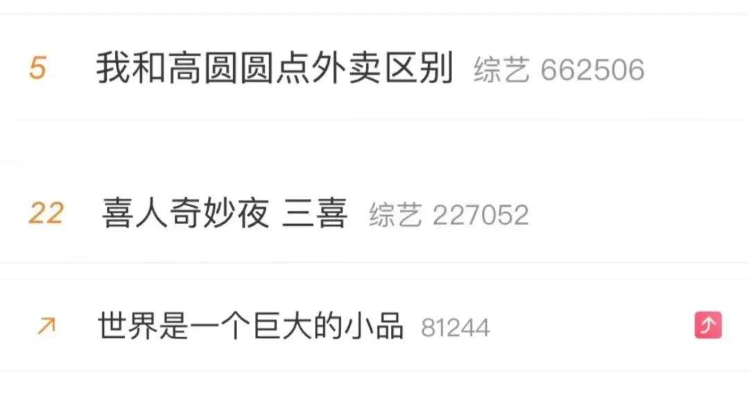 #我和高圓圓點外賣區別、#喜人奇妙夜 三喜、#世界是一個巨大的小品等話題引起討論。