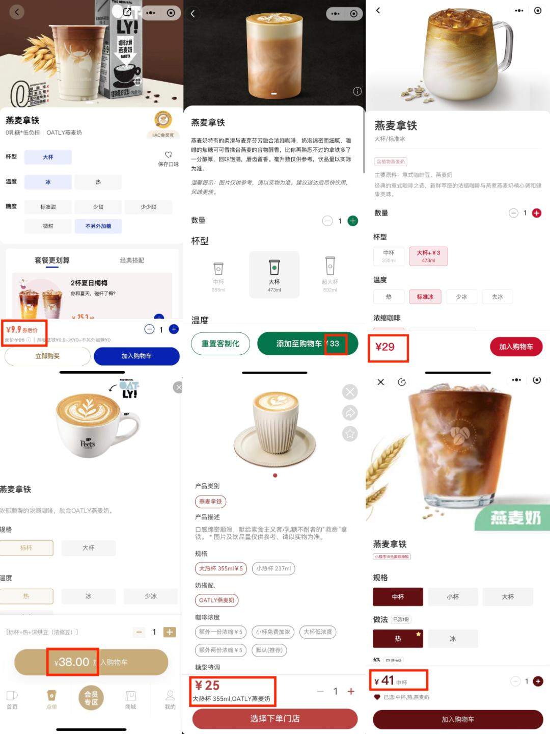 不同咖啡品牌燕麥拿鐵價格,圖源各品牌微信小程序