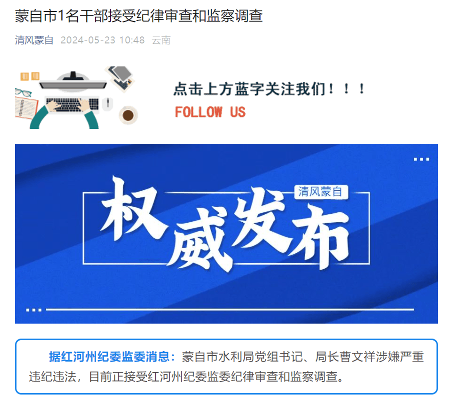 據清風蒙自2024年5月23日消息,蒙自市水利局黨組書記、局長曹文祥涉嫌嚴重違紀違法,目前正接受紅河州紀委監委紀律審查和監察調查。5月30日,曹文祥被免去蒙自市水利局局長職務。