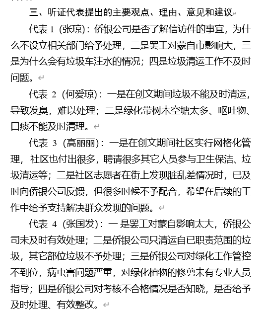 聽證代表在聽證會上對垃圾清運、羣眾反饋、綠化工作等問題提出意見。其中,一位聽證代表表示,社區志願者在街上發現髒亂差情況時,已及時向僑銀公司反饋,但很多時候不予配合,希望在後續的工作中給予支持解決羣眾發現的問題。
