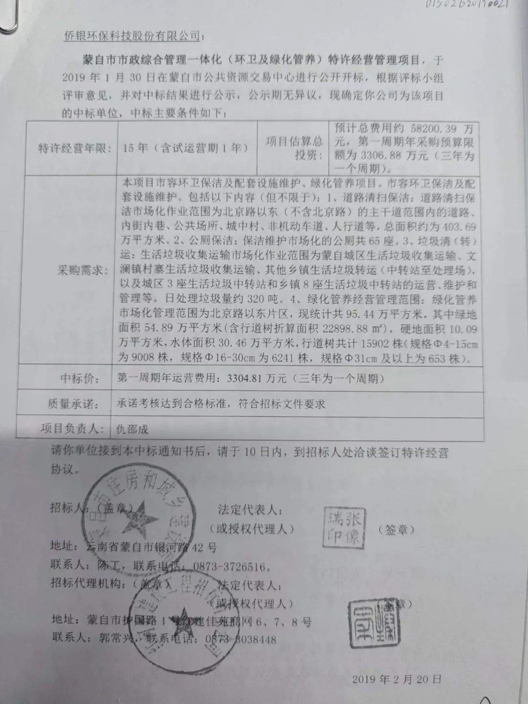 當年1月30日,蒙自市市政綜合管理一體化(環衞及綠化管養)特許經營管理項目(簡稱:蒙自環衞項目)進行公開招標,並於2月20日確定僑銀環保科技股份有限公司(2020年更名為僑銀股份)為中標單位。中標條件顯示,項目特許經營年限為15年(含試運營期1年),預計總費用約58200.39萬元,第一週期採購預算限額為3306.88萬元,第一週期年運營費用為3304.81萬元(三年為一個週期)。