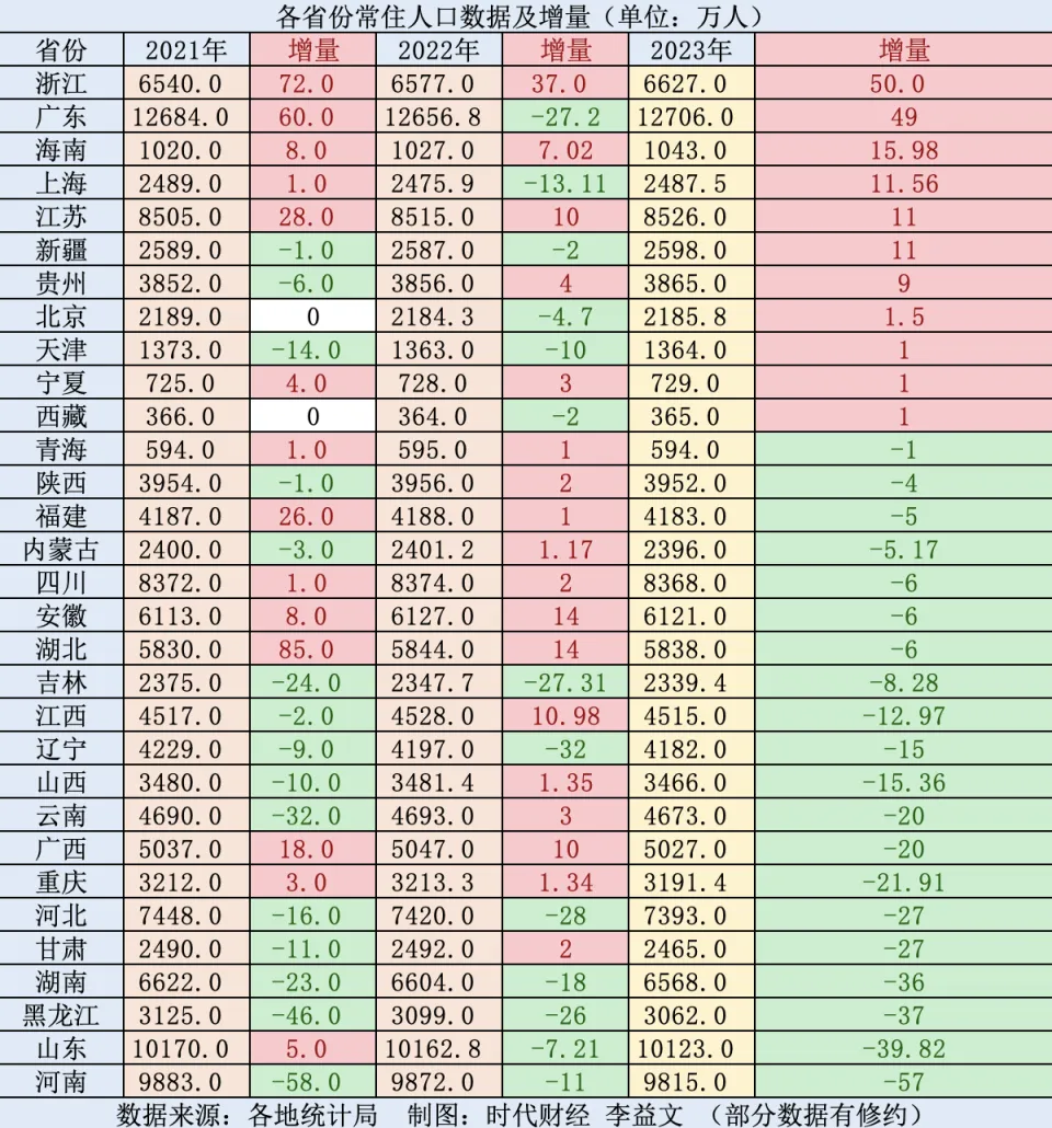 在出生人口增長放緩的大背景下,各省份間對人口的吸引愈發困難。根據已公開的數據,2023年31個省份中,11省份的常住人口數量呈正增長,其增量合計約162萬,增長省份數量處於歷史低位。