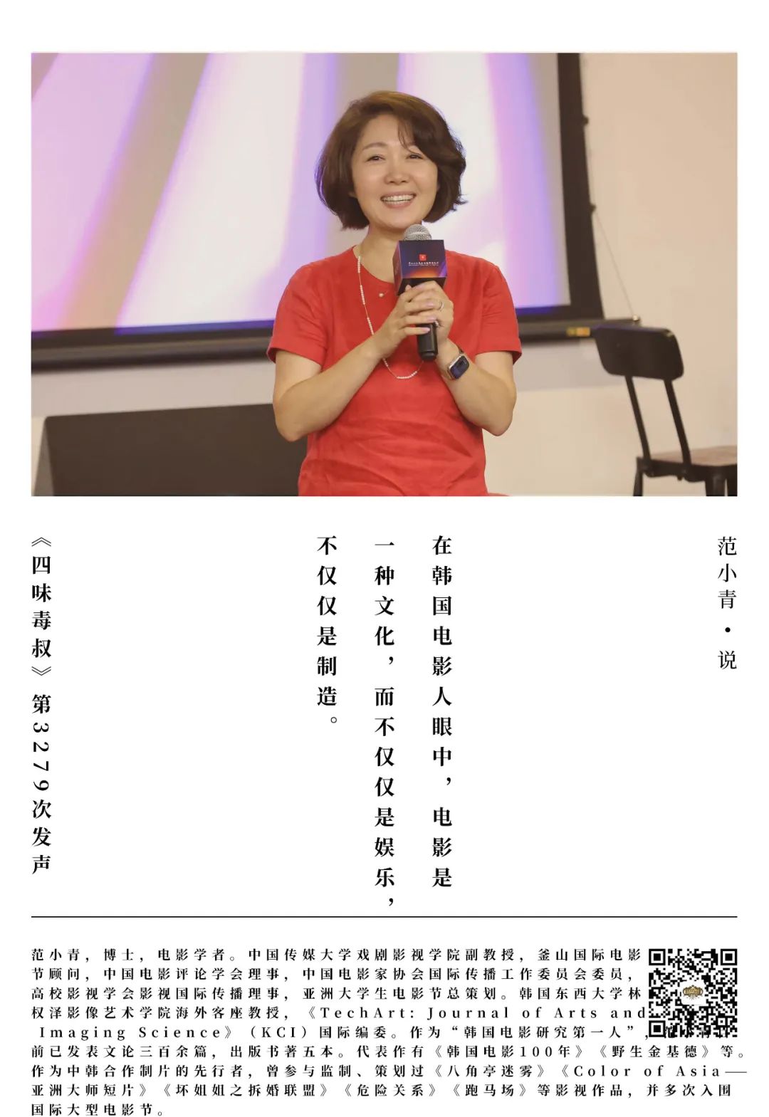 **譚飛:**歡迎我們華語圈的韓國電影研究第一人範小青老師。