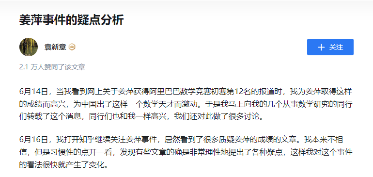 原本,這場質疑姜萍的風波正在走向平息。可北大教授、著名數學家袁新意深夜又發了一篇文章:《姜萍事件的疑點分析》。這篇文章的出現,把姜萍重新推回了輿論的漩渦。作為北大教授,袁新意沒有一棒子否決姜萍,而是提出了五大疑點: