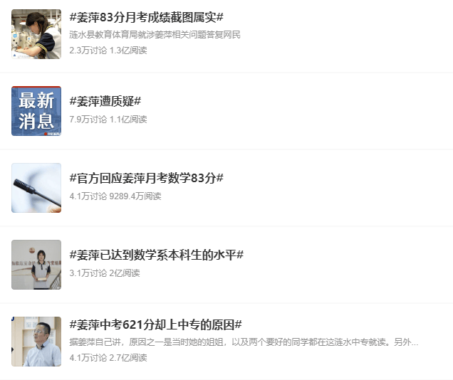 **官媒在做內容轉發時,也不是每一個消息都去實地考證。**一般而言,某個權威性官媒發了,其他官媒賬號就批量轉發。這就導致,一個官媒錯了,其他官媒全都發錯的。大家可以明顯地看到,在各大平台,一些官媒消息連標題裏面都有錯別字。當官媒一啓動宣傳,大量的自媒體就像禿鷹一樣,一擁而上。而且,吹捧一個天才少女,是正能量,是零風險的,是能獲得大眾普遍認同的。有了自媒體作為放大器,姜萍一夜之間就被推上了輿論的最高點。
