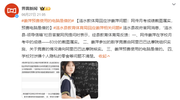 關於網上公開的姜萍數學月考不及格,漣水縣教育局也回應了:月考成績83屬實,不及格。**同時,在鋪天蓋地的質疑聲中,漣水縣教育局選擇了一箇中立立場,既不承認姜萍是天才,也不否認,而是把鍋甩給了阿里達摩院。**這個比賽是阿里舉辦的,尋求真相的網友去諮詢阿里,不要問漣水縣教育局了。另外,漣水縣教育特別提到,姜萍的電腦是借的,到借誰的?沒有説。