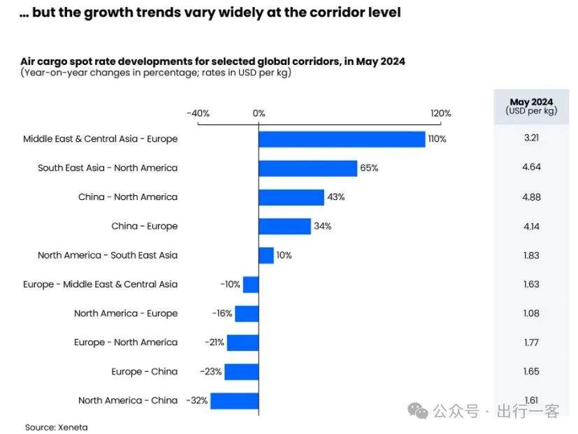圖源Xeneta 2024年5月選定航線的航空貨運現貨價格動態