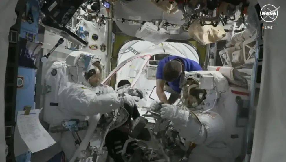 6月24日,身着白色宇航服的NASA宇航員戴森(前左)和巴拉特(前右)因宇航服泄漏而放棄了太空行走計劃。 圖源:NASA