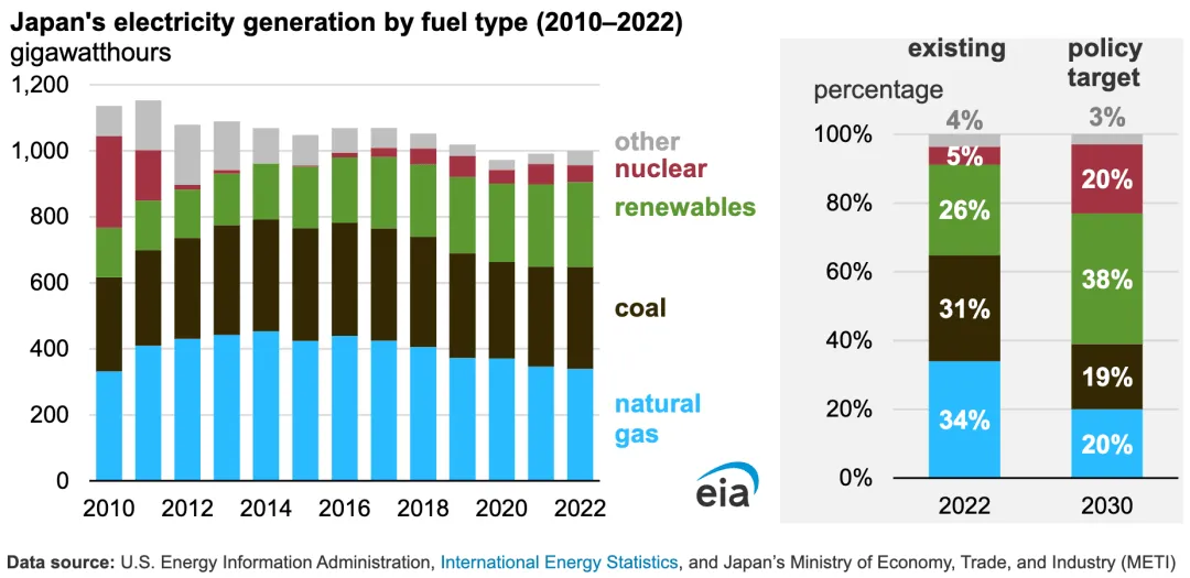 其後一些核電反應堆通過安全檢查後陸續重新啓動,到2022年日本核電發電量佔比也僅有5%左右(EIA數據)。