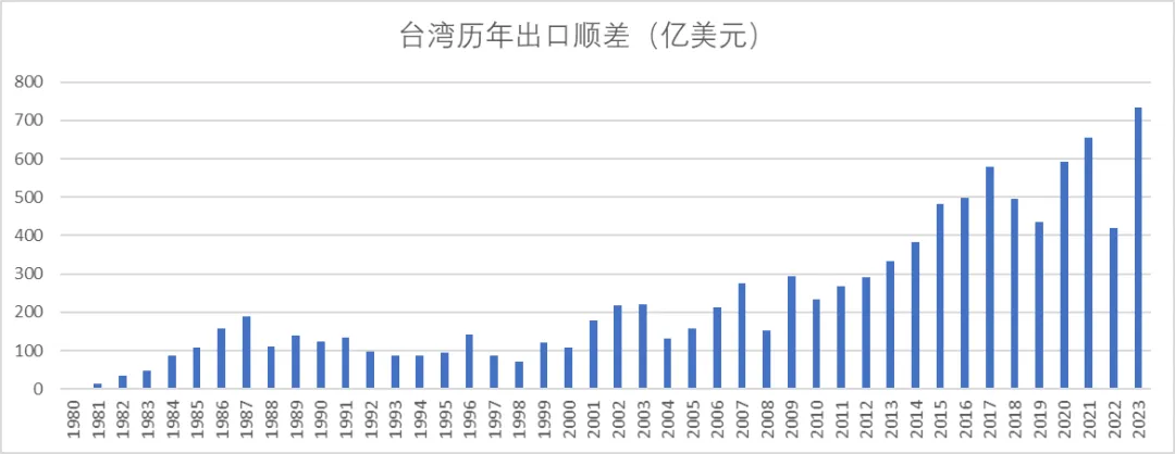 2023年台灣順差達到歷史最高水平,歷史首次突破700億美元,達到733.77億美元。