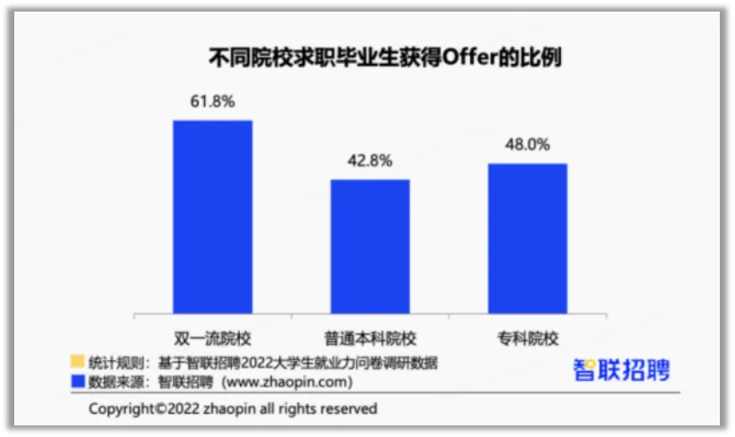 智聯招聘的數據顯示,普本院校畢業生獲得offer的概率不僅低於雙一流院校,而且還低於專科院校。