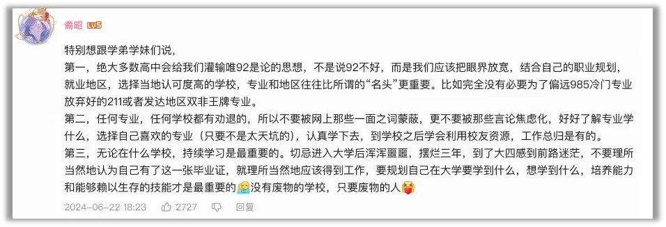 還有人真誠地告誡學弟學妹:“沒有廢物的學校,只有廢物的人。”