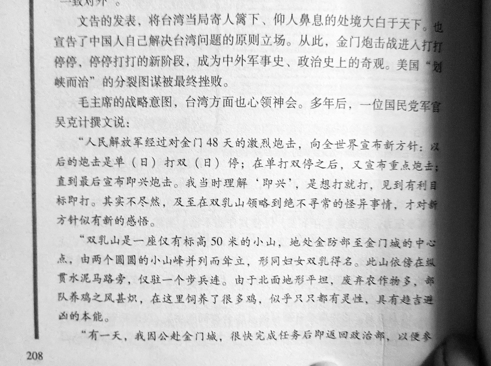 1958年8月23日起,人民解放軍經過對金門48天的激烈炮擊後,向全世界宣佈新方針:以後的炮擊是單日打炮,雙日停。在單打雙停之後;又宣佈重點炮擊一些地方;直到最後宣佈即興炮擊。我當時理解“即興”,是想打就打,見到有利目標即打。其實不盡然,及至在雙金門乳山,領略到絕不尋常的怪異事情,才對新北京的方針似有新的感悟。