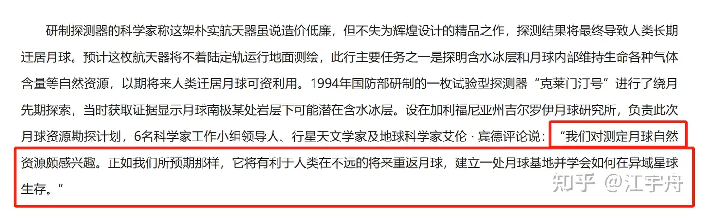 當時的工作小組領導人表示,該探測器“有利於人類在不遠的將來重返月球”(美國實施月球資源勘測計劃 (worldscience.cn))。