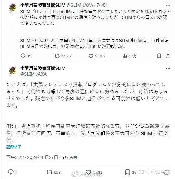 2024.1:SLIM於19日在月表着陸,但由於着陸時太陽能電池板未能朝向太陽方向,故無法為電池發電。5 月 28 日,日本宇宙航空研究開發機構宣佈放棄與 SLIM 恢復通信(命運難測:日本小型登月探測器恐永久沉睡月球)。