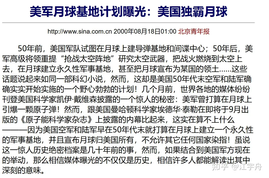 2000.8:《原子能科學家雜誌》曝光歷史上的美軍月球基地計劃,及將月球收歸國有的意圖。揭露了美國航天從一開始就與自己所標榜的“人類應該和平利用月球和外太空”相違背的歷史事實,且根據同期軍方相關人士的主張,認為美國應該在2020年之前“全面搶佔太空戰場”。(美軍月球基地計劃曝光:美國獨霸月球_國際新聞_新聞中心_新浪網 (sina.com.cn))