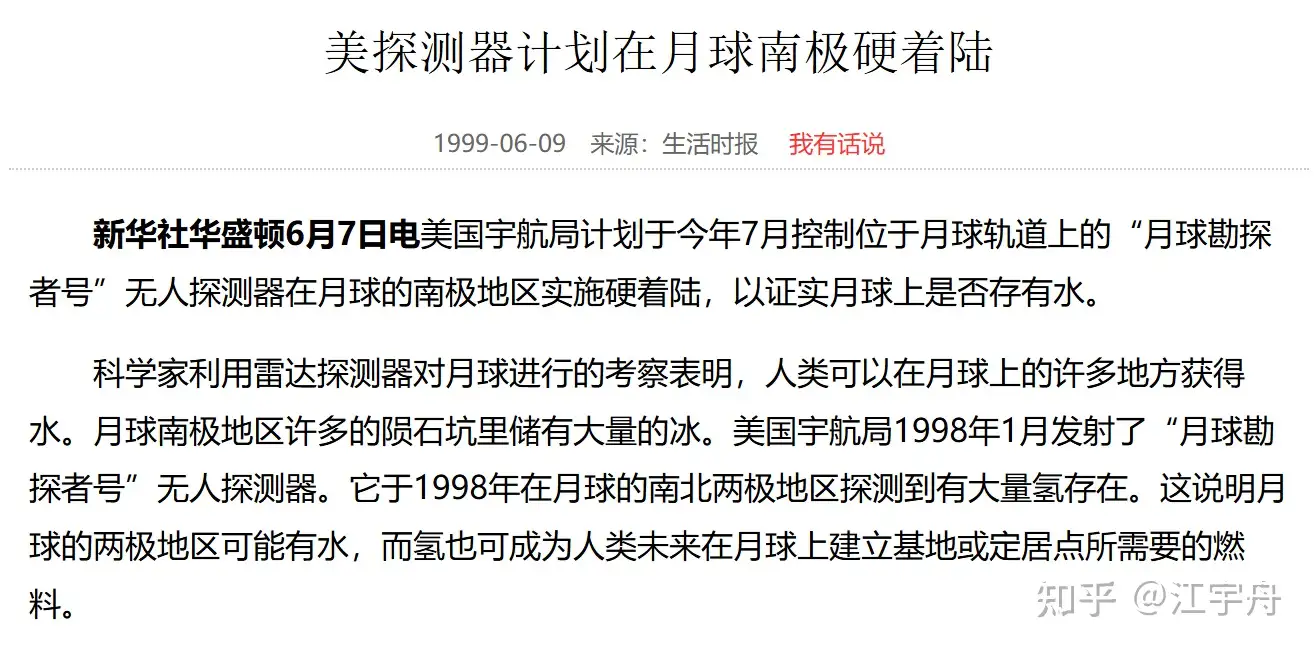 1999.6-7:既然發現水冰了,後續得繼續安排,於是1999年6月“月球勘探者”號升空,計劃在月球南極硬着陸來證實是否有水(美探測器計劃在月球南極硬着陸_生活時報_光明網 (gmw.cn))。該探測器造價6300萬美元,發射費用為2600萬美元,是當時空間探索計劃中耗資最省、儀器裝備最精良的探測器之一。1999年7月31日該衞星撞擊靠近月球南極點,原本預期撞擊時揚起的表土可以檢測到水的存在,但並未成功。
