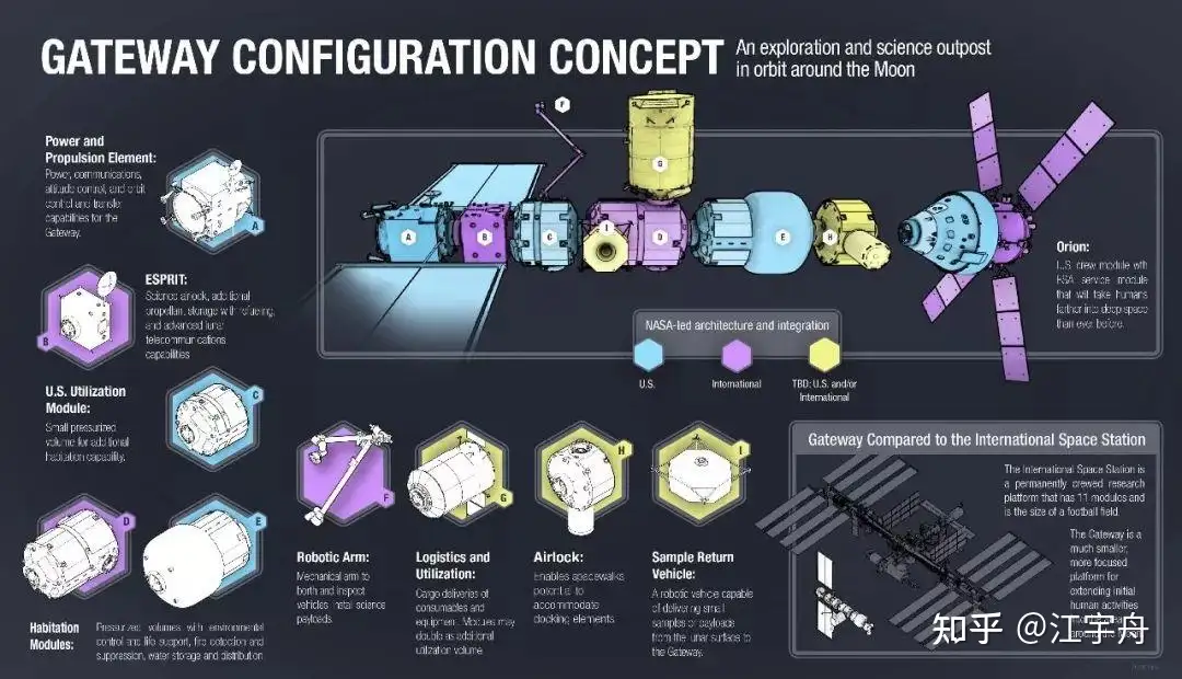 門户(Gateway)月球軌道空間站當前的結構安排。藍色模塊是美國負責標段,紫色模塊是國際組成部分,黃色模塊是既有美國也有國際貢獻或待定。