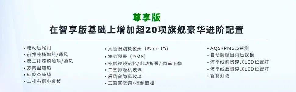 而且配置也很良心,無論是增程還是純電,中配的尊享版比起低配的智享版只貴了 7000 塊,都是像座椅通風加熱、電尾門、電動外後視鏡、方向盤加熱之類的實用配置。