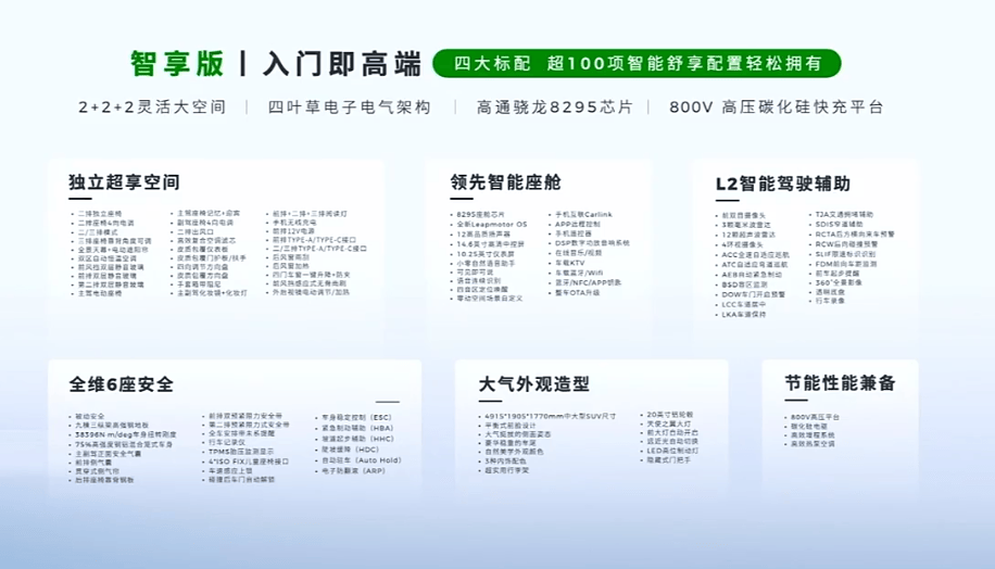 雖然名字很抽象,但是一台中型 6 座 SUV ,帶 8295 的車機, Orin-X 的智駕, 21 揚聲器,純電版本還標配 800V 快充,才賣 15.58 - 18.58 萬。