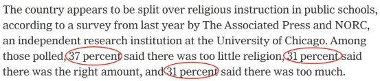 根據美聯社和芝加哥大學的獨立研究機構NORC去年的一項調查顯示,美國關於公立學校的宗教教育存在分歧。調查顯示,有37%的受訪者認為公立學校提供的宗教教育太少,31%的人認為提供的數量適當,而另外31%的人認為提供的宗教教育過多。
