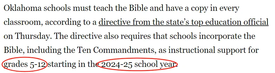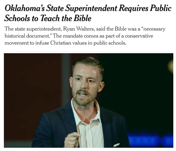 6月27日(星期四)俄克拉荷馬州州教育委員會中,州公共教育主管瑞安·沃爾特斯(Ryan Walters)宣佈:公立學校從2024-25學年開始,將《聖經》納入5至12年級的課程之中。