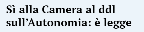 據意媒綜合報道,6月18日,經過眾議院徹夜漫長的討論審議後,《差異化自治Autonomia differenziata》法案終於被通過。