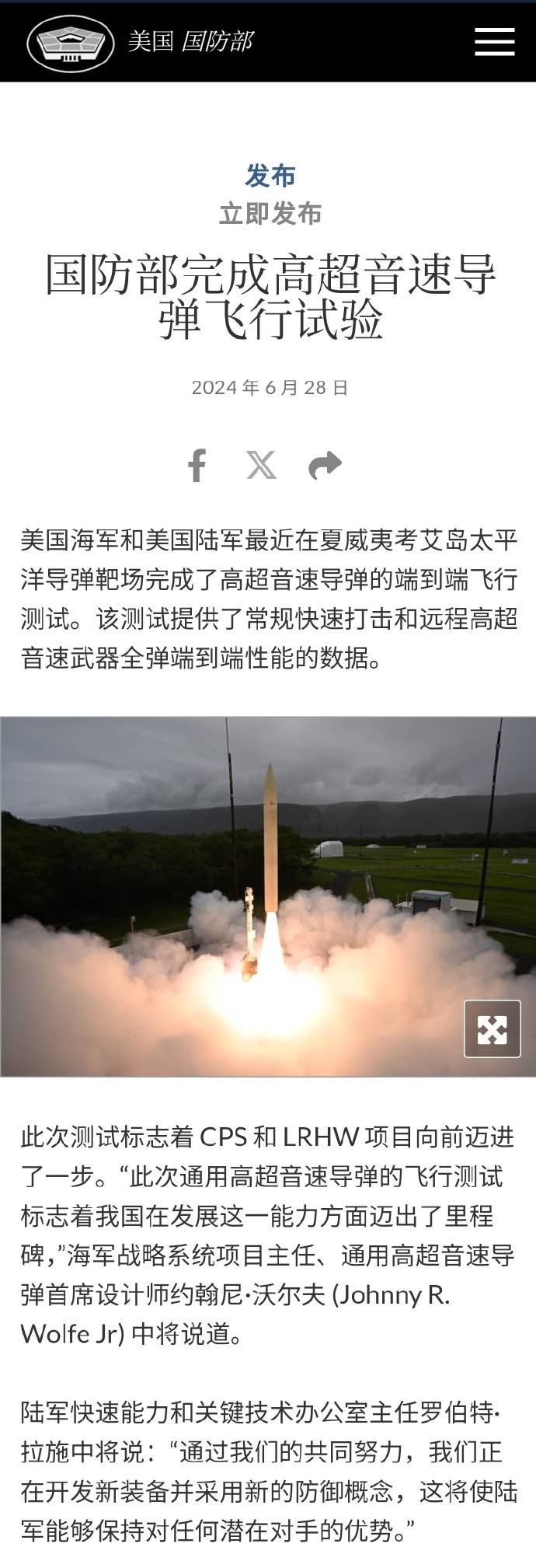 6月28日,美國國防部宣佈,MD一等人和三等人聯合開發的高超音速武器:CPS/LRHW(陸軍又稱為暗鷹)完成「端對端」(打靶)測試,也就是完整系統測試。測試使用的是夏威夷考艾島西海岸的巴金沙太平洋導彈靶場的固定發射架,測試時間為5月底。