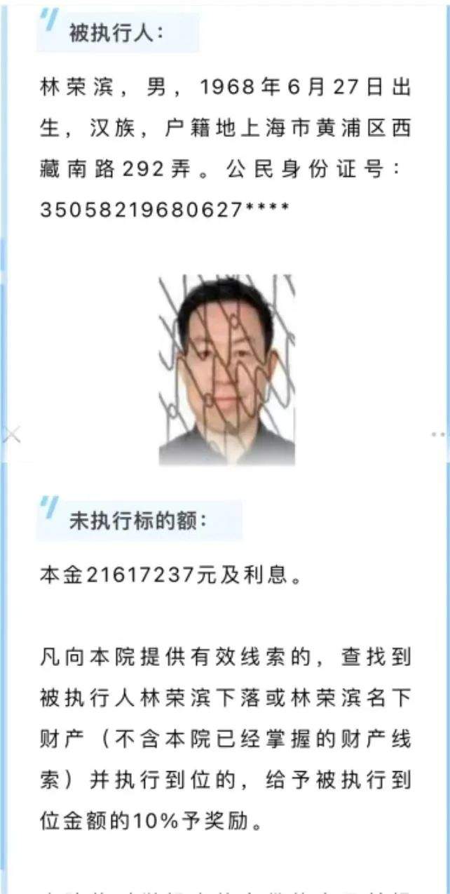 行業寒冬下,一些房企還在苦苦支撐,三盛集團董事長林榮濱則在被“懸賞”中殞落。北京海淀法院最近發佈的執行公告表明,這位曾經上過胡潤富豪榜的泉州籍商人,如今連2000萬元的借款擔保都還不起了。