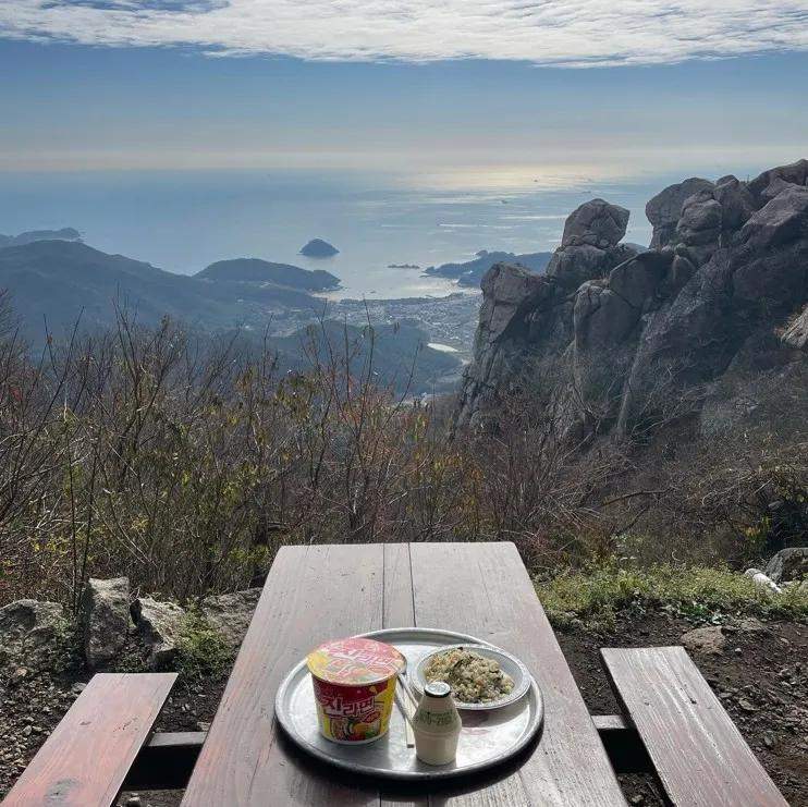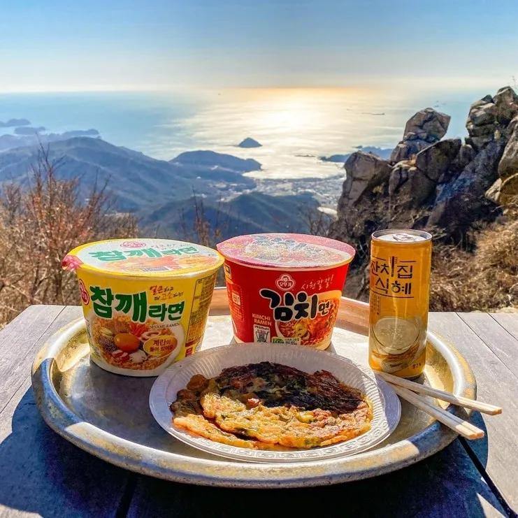 原來在韓國,登山者攜帶拉麪(一種裝在一次性盒子裏的方便麪)一邊爬山一邊吃是一種時尚。在社交媒體上曬出“山頂吃泡麪”的照片,更是成為韓國年輕人登上過漢拿山的證明。尤其是位於漢拿山上海拔1740米的一個休息點,很多登山者會選在那裏吃麪。