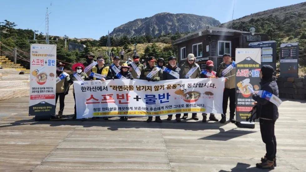 如今,漢拿山上各處都掛起了“保護乾淨的漢拿山,將其傳給後代”的橫幅,敦促登山者“半湯+半水”,意思是希望大家只加一半的水來泡麪。