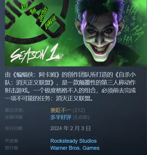 除了電影,今年華納還推出了一款名叫《自殺小隊 消滅正義聯盟》的賽季制遊戲,這款遊戲在steam處於褒貶不一的狀態,據報道,華納高層對這個遊戲的收益表現很是失望。