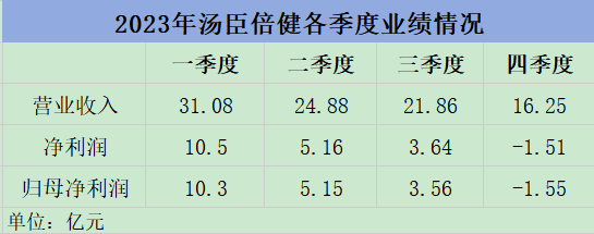 湯臣倍健的財報數據顯示,2023年一季度至四季度,湯臣倍健的單季度營收分別為31.08億元、24.88億元、21.86億元、16.25億元,呈現每季度下滑態勢;淨利潤和歸母淨利潤同樣每個季度下滑,到了去年第四季度,淨利潤和歸母淨利潤甚至出現了虧損。2023年第四季度湯臣倍健歸母淨利潤虧損了1.55億元。