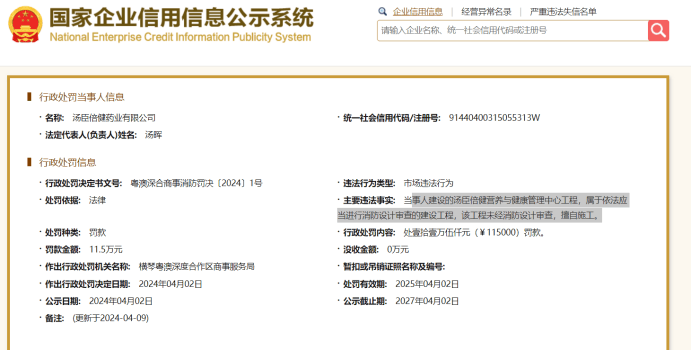 作者查詢發現,今年4月份,湯臣倍健全資子公司湯臣倍健藥業建設的湯臣倍健營養與健康管理中心工程,屬於依法應當進行消防設計審查的建設工程,而湯臣倍健建設的該工程卻未經消防設計審查就擅自施工,最終被有關部門處以11.5萬元的罰款。