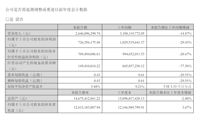 湯臣倍健今年的一季報顯示,1-3月湯臣倍健營業收入26.46億元,同比減少14.87%;歸母淨利潤7.27億元**,同比減少近30%**;扣非後的淨利潤7.09億元,同比減少28.67%。