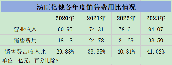 而銷售費用佔同期營收的比重,近幾年來也是逐步攀升。2020年至2023年湯臣倍健銷售費用佔同期營收的比重分別為29.83%、33.35%、40.31%、41.02%,短短三年時間,銷售費率增加了近12個百分點。這意味着10塊錢的營收,是用4塊一毛錢換來的,如此之高的銷售費用率,使得湯臣倍健成了妥妥的營銷驅動型公司。