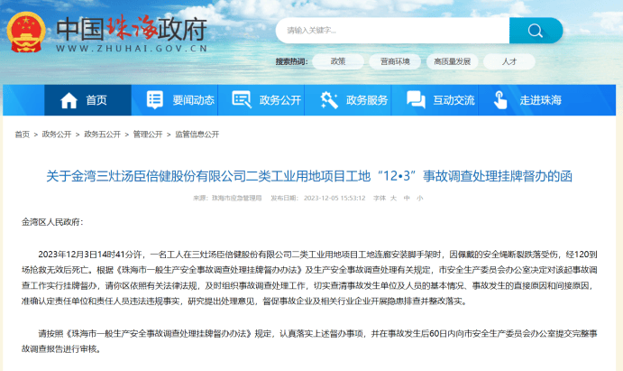 去年12月5日,珠海市人民政府官網發佈了一則《關於金灣三灶湯臣倍健股份有限公司二類工業用地項目工地“12•3”事故調查處理掛牌督辦的函》,函件顯示,去年12月3日,在位於金灣區三灶的湯臣倍健股份有限公司二類工業用地項目工地上,在連廊安裝腳手架時,一名工人因佩戴的安全繩斷裂跌落受傷,120到場搶救無效後死亡。