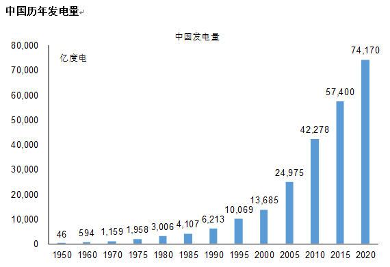 從2006~2020年這15年時期(即“十一五”到“十三五”計劃時期),在每個五年計劃時期內中國發電量的增加量都超過了1.5萬億千瓦時,都超過了前50年發電量增長的水平。