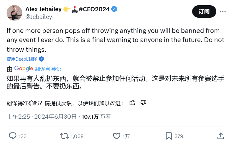 沒過多久,賽事主辦者Alex Jebailey在推特上發文詢問Dyloch選手的PayPal賬號,並表示應該有人站出來為這台被砸壞的照明設備買單。隨後Alex發佈了一篇正式聲明,警告參賽選手不要再隨手亂扔東西,因為被Dyloch選手砸壞的那台LED燈,是他們花了2992美元的高價買過來的。