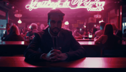 ( 提示詞:Static, locked-off shot, Harsh, neon lights, A solitary figure sitting at a bar, Sipping a drink, staring into space, A crowded, dimly lit bar, Lonely, melancholic )