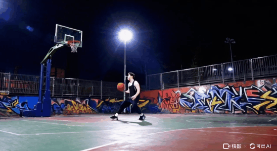 到了可靈 AI 這邊,畫面就更詭異了。扔出去的籃球原地分身,人也長出第三隻手。