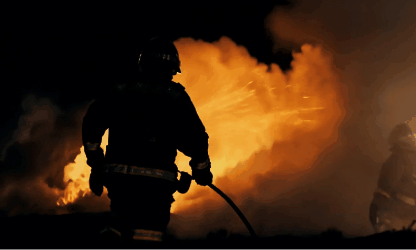 ( 提示詞:Silhouette shot,Fiery flames of a burning building, A firefighter battling the blaze, Spraying water, rescuing people,A burning building in the night, Dramatic, heroic )